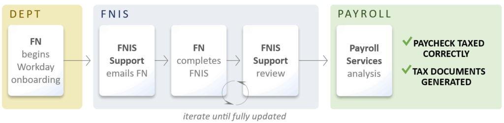 The Foreign National Information System (FNIS) collects data from foreign national (FN) employees so that Payroll Services can correctly tax their WashU paychecks and generate applicable tax documents. Without a fully updated FNIS record, FN paychecks may be taxed incorrectly.